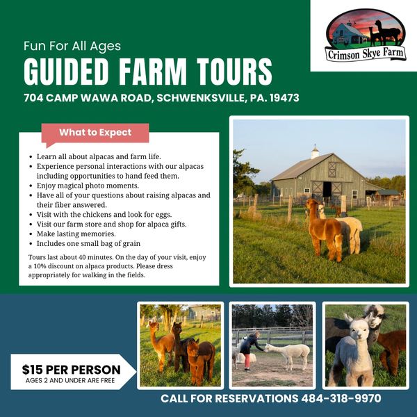 Come make lasting memories with Crimson Skye Farm guided alpaca farm tours! Experience personal interactions with our animals, learn all about alpacas and farm life and so much more!