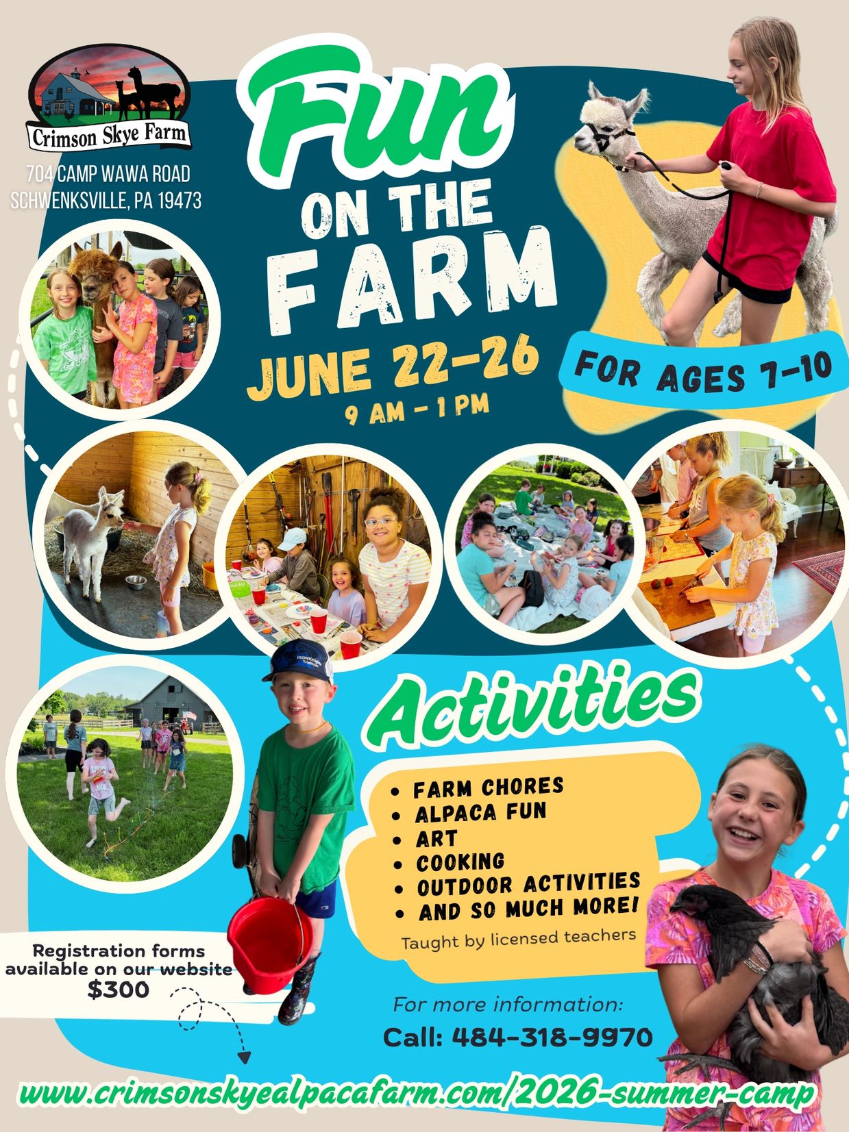 Each day will be spent in a combination of different activities including farm chores, crafts, cooking, art, and good old-fashioned fun. Campers will learn all about life on the farm. They will have daily chores where they care for and learn about alpacas. Additionally, there will be formal Art lessons taught by a trained art teacher. Various mediums will be used to create beautiful art projects. Each day will include a cooking component where we prepare a snack to be enjoyed by everyone. Campers will participate in fun outdoor activities while exploring the farm and fields. We will incorporate learning about our apiary and the importance of bees. Campers will leave the camp with an appreciation of life on a farm!